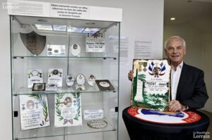 Serge Barcellini devant la vitrine, au siège du Souvenir français à Paris, où sont exposées ces plaques. Photo Alexandre Marchi