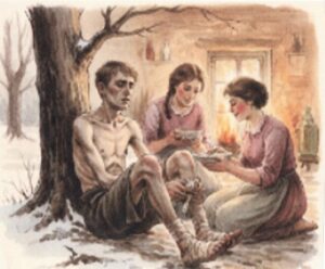 Après quinze jours d’errance, il trouva refuge dans une ferme près de Kopanka. Au matin, il fut découvert par deux jeunes femmes ukrainiennes : Motja (32 ans) et Anastasia (34 ans). Malgré la barrière de la langue, une solidarité immédiate se créa. Elles le nourrirent et le soignèrent. Leurs parents ayant été enrôlés de force dans l’armée russe, elles se retrouvaient seules pour gérer la ferme