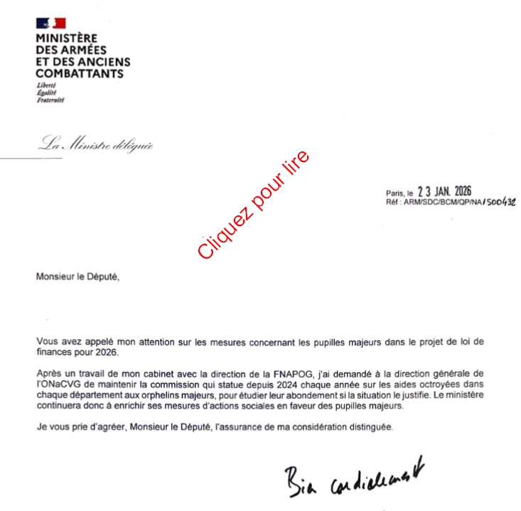 Durant le dernier trimestre de 2025 et ce, grâce à l’appui de nos fidèles parlementaires Laurent CROIZIER et Jean François LONGEOT, à nos démarches auprès du cabinet de Madame la Ministre Alice RUFO et de nos échanges avec les services de Madame Verdier Jouclas, Directrice générale de l’ONaCVG, nous sommes assurés du maintien de la commission Ad Hoc destinée à apporter une aide complémentaire aux Pupilles Nationales Majeurs en difficulté.